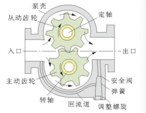 要回答齒(chǐ)輪油泵進出(chū)油口能否反接,首先要弄明白齒輪油泵的工作(zuò)原理。如圖是一齒輪油泵工作原理圖,它是由裝在殼體(tǐ)內的一對齒輪所組成(chéng)。齒輪兩個端麵靠端蓋(gài)密封。殼體、端蓋和齒輪的各(gè)個齒間槽,這三者形成左右兩個密閉的工作(zuò)空間。當主動齒輪在(zài)原動機帶動下(xià),如圖所示逆時針方向旋(xuán)轉時,右側(cè)密封的工作空間的牙齒逐漸齧(niè)合,工作空間的(de)容積逐漸增大,形成部分真空,油箱中(zhōng)的油液在外界大氣壓力的(de)作用(yòng)下,經油管兒被吸入右側油腔。吸入到齒間的油液在(zài)密封的工作空間隨齒輪的旋轉被(bèi)帶到左側油腔。因左側的牙齒逐漸進入齧合,工作空間(jiān)的(de)容積逐漸減小(xiǎo),所以齒間的油液(yè)被擠出。