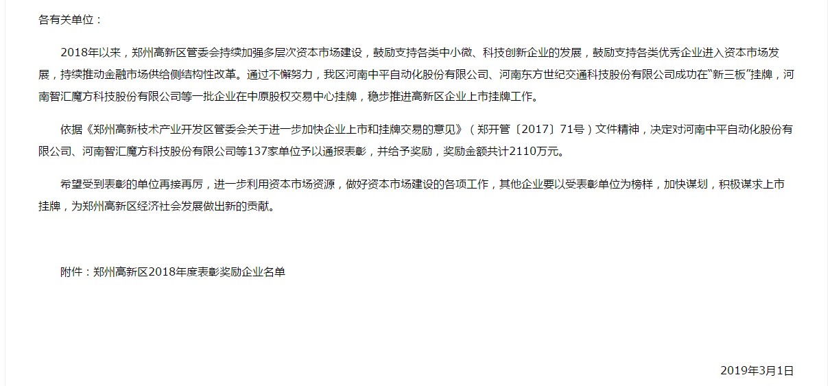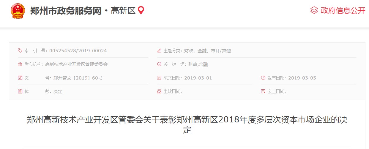 [文章內容簡介]:轉發:鄭州高新技術產業開發區管委會關於表彰鄭(zhèng)州高新區2018年度多層次資本市場企業(yè)的(de)決(jué)定