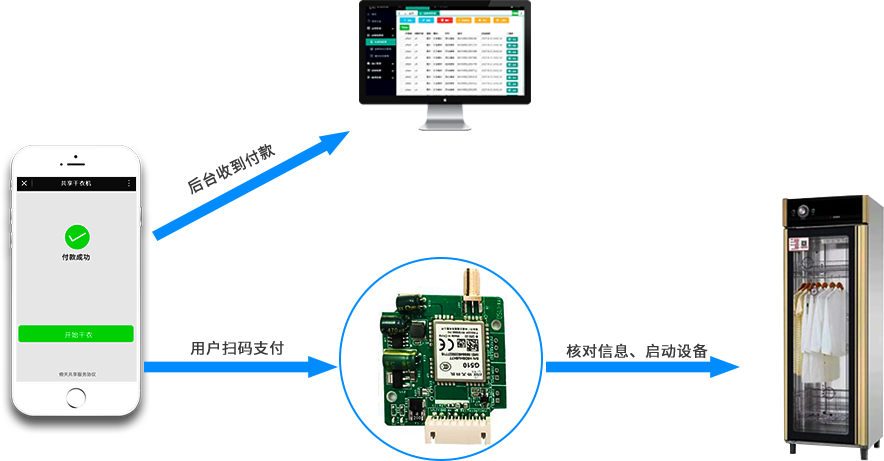 共享幹衣機采(cǎi)用無人經營模式,用戶(hù)使用掃碼支付使用(yòng),運營商則借助雲管理平台實現遠程管理。